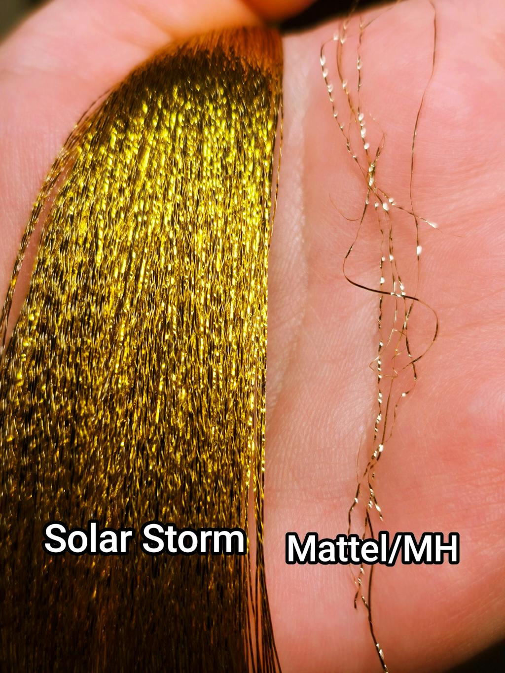 I really enjoy the overall quality of the tinsel. It's not as brittle and easy to rip like the tinsel Mattel uses for Monster High dolls. I was planning on replacing it on my dolls, however I wish the gold color was leaning more towards a warm tone. It's leaning towards a yellow-greenish color in person. I also find that the tinsel tends to look greyish and dull from some angles, especially if there are multiple strands next to each other. I have yet to try boil washing it, but it does feel like it would handle it really well!